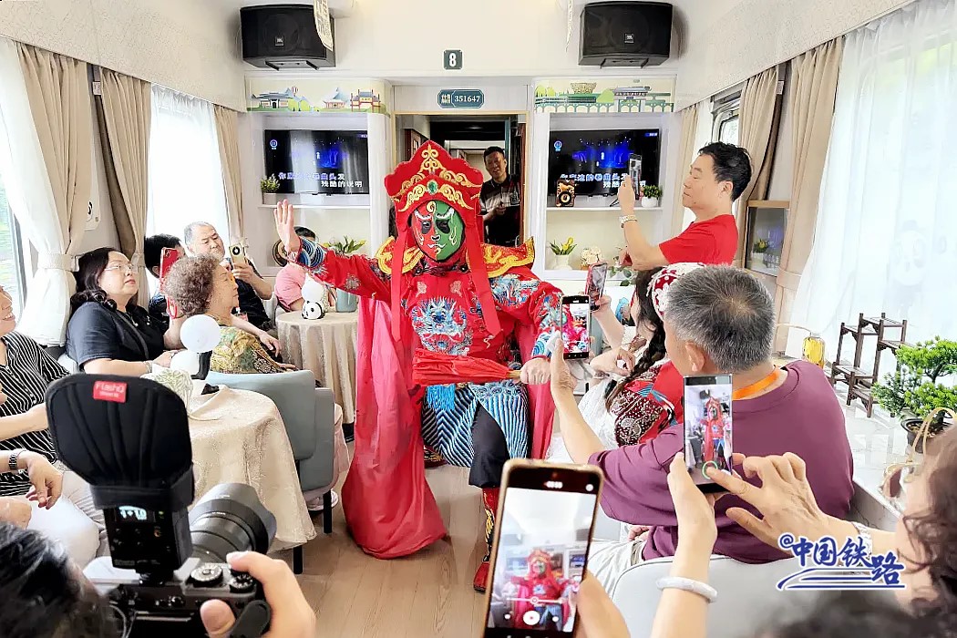 A face-changing performance of Sichuan Opera is staged on a "panda train." (Photo from the official account of China Railway on WeChat)