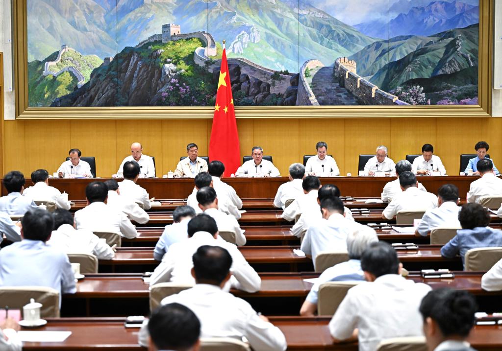 Chinese Premier Li Qiang presides over the fifth plenary meeting of the State Council on Aug. 16, 2024. Li stressed solid work to implement reform measures and accomplish the annual economic and social development goals with impetus from further deepening reform comprehensively. (Xinhua/Yan Yan)