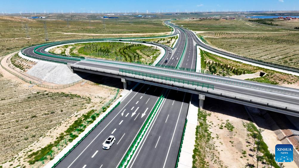 This photo taken on Aug. 16, 2024 shows a vehicle running along the Yinchuan-Kunming highway in northwest China's Ningxia Hui Autonomous Region. A section of the Yinchuan-Kunming highway within Ningxia, from Taiyangshan development zone to Pengyang, was completed and opened to traffic on Friday, marking the full opening of the Yinchuan-Kunming highway.