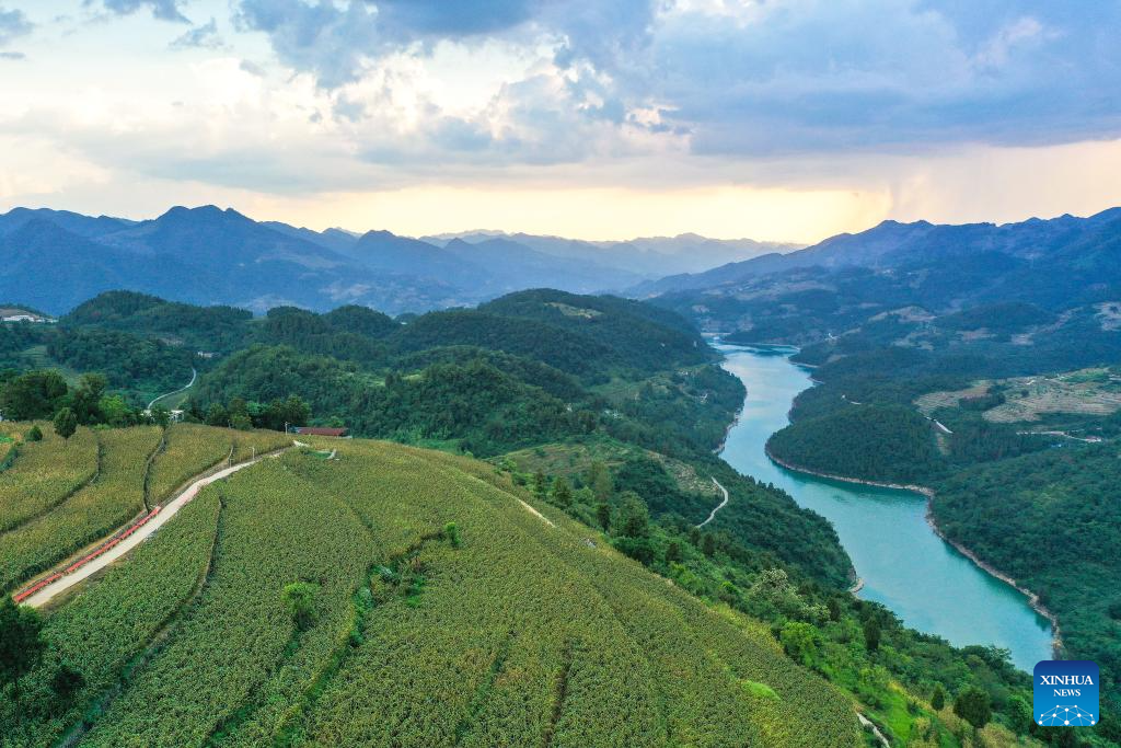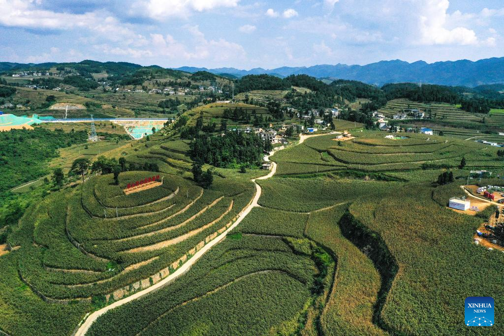 An aerial drone photo shows a sorghum field at Maopo Village of Changgang Town, Huairen City of southwest China's Guizhou Province, Aug. 15, 2024. Covering an area of 24,000 hectares, the sorghum fields in Huairen has successively entered its harvest season recently. (Xinhua/Yang Wenbin)