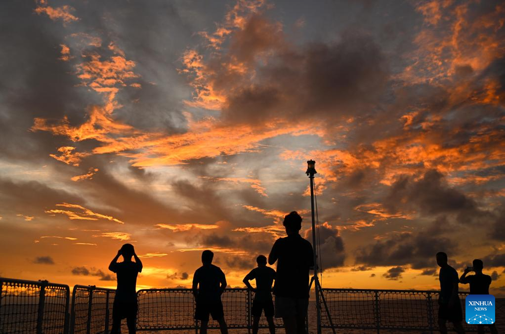 Law enforcers enjoy the sunset view aboard the China Coast Guard (CCG) vessel Hebao in waters adjacent to China's Huangyan Dao on June 23, 2024.