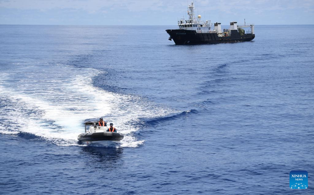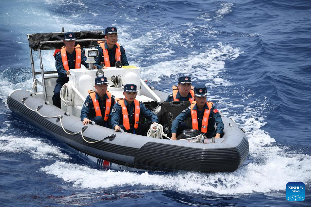 Law enforcers aboard a dinghy conduct a maneuver drill in waters adjacent to China's Huangyan Dao on June 19, 2024.