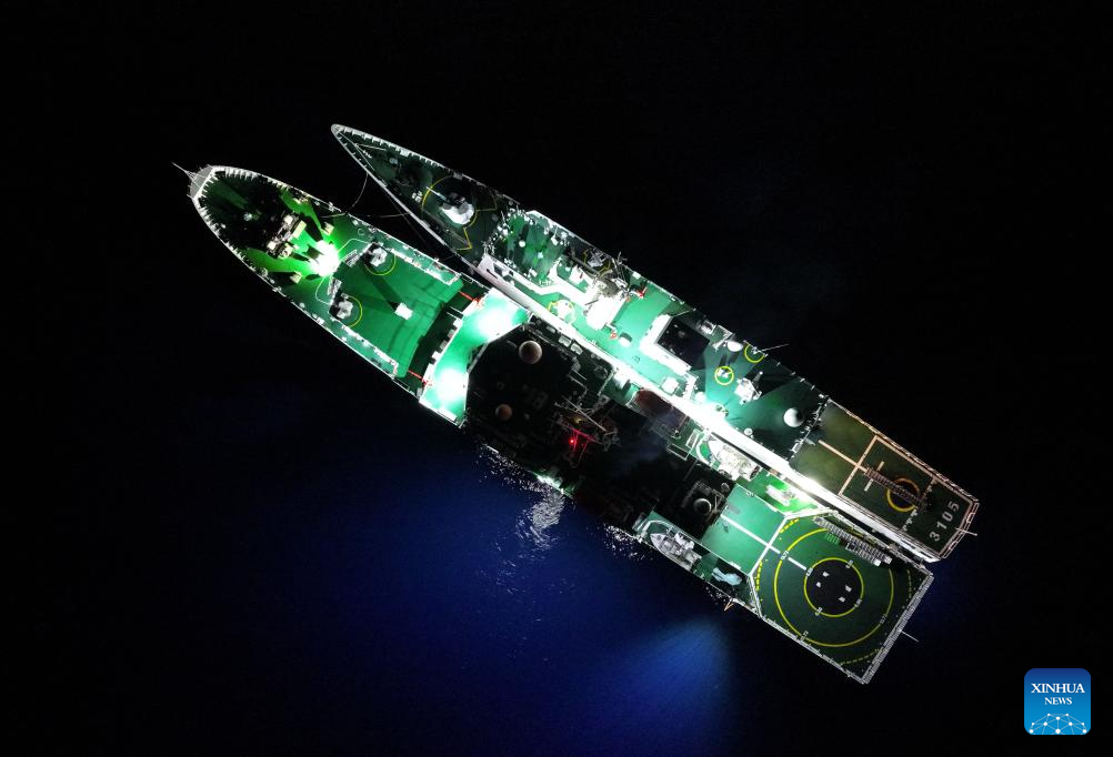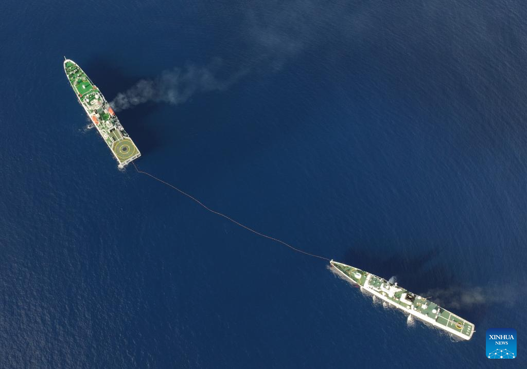 An aerial drone photo taken on July 11, 2024 shows China Coast Guard (CCG) vessels Hebao (above) and Wanshan on a fuel refilling drill in waters adjacent to China's Huangyan Dao.