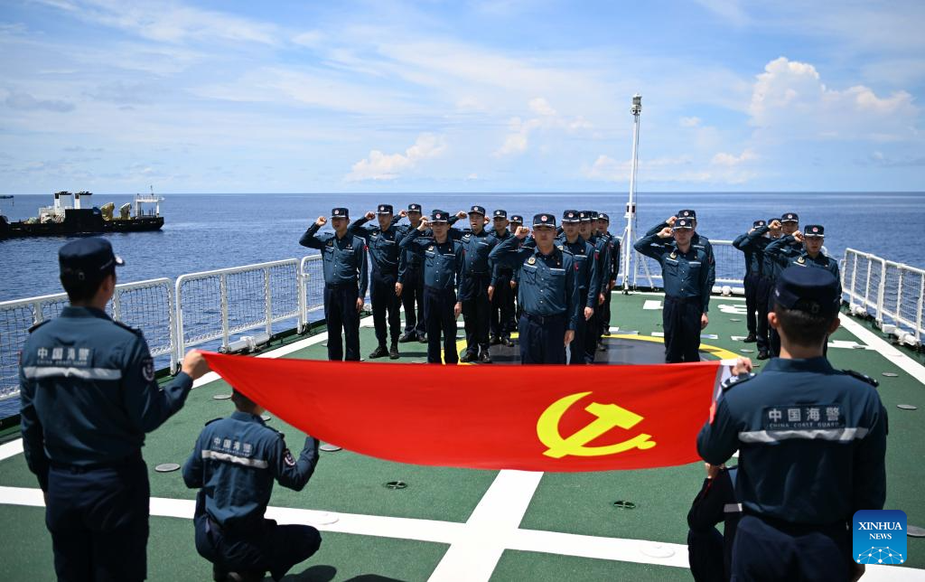 Law enforcers review the admission oath of the Communist Party of China aboard the China Coast Guard (CCG) vessel Hebao in waters adjacent to China's Huangyan Dao on June 30, 2024.