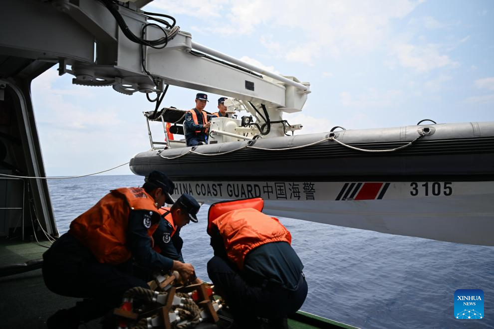 Law enforcers drop a dinghy aboard the China Coast Guard (CCG) vessel Hebao on June 19, 2024.