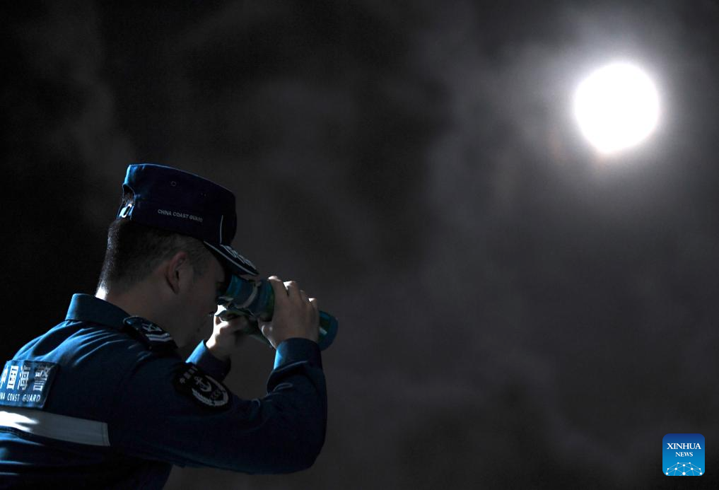 A law enforcer is on the watch at night aboard the China Coast Guard (CCG) vessel Hebao on June 22, 2024.