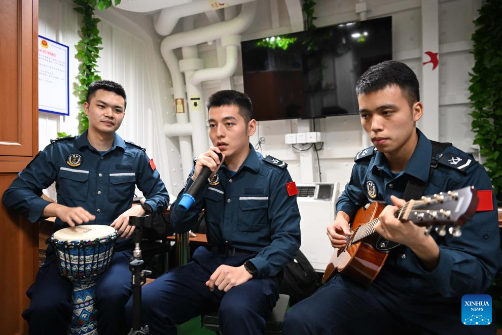Law enforcers amuse themselves at the reading room aboard the China Coast Guard (CCG) vessel Hebao on July 19, 2024.