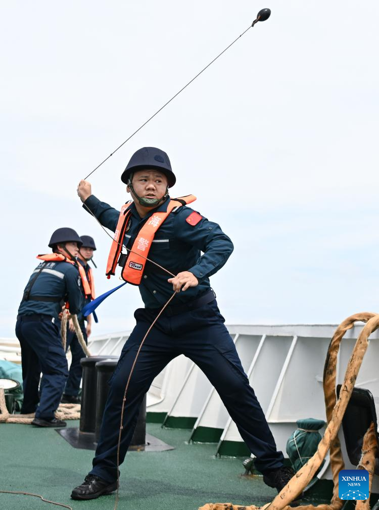 Law enforcers on a drill retract cables aboard the China Coast Guard (CCG) vessel Hebao on June 30, 2024.