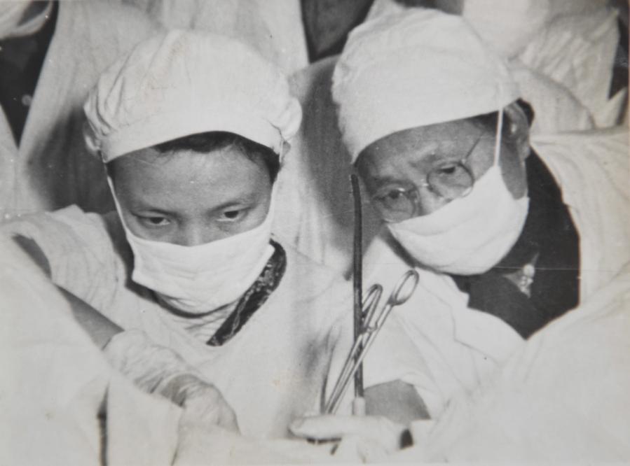 This file photo taken in the 1970s shows Xie Shuxiang (L) conducting a surgery under the guidance of her mother Yue Yicheng. (Xinhua)