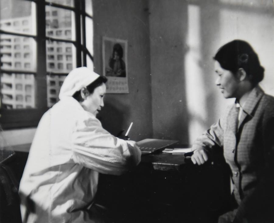 This file photo taken in the 1970s shows Xie Shuxiang (L) communicating with a patient. (Xinhua)
