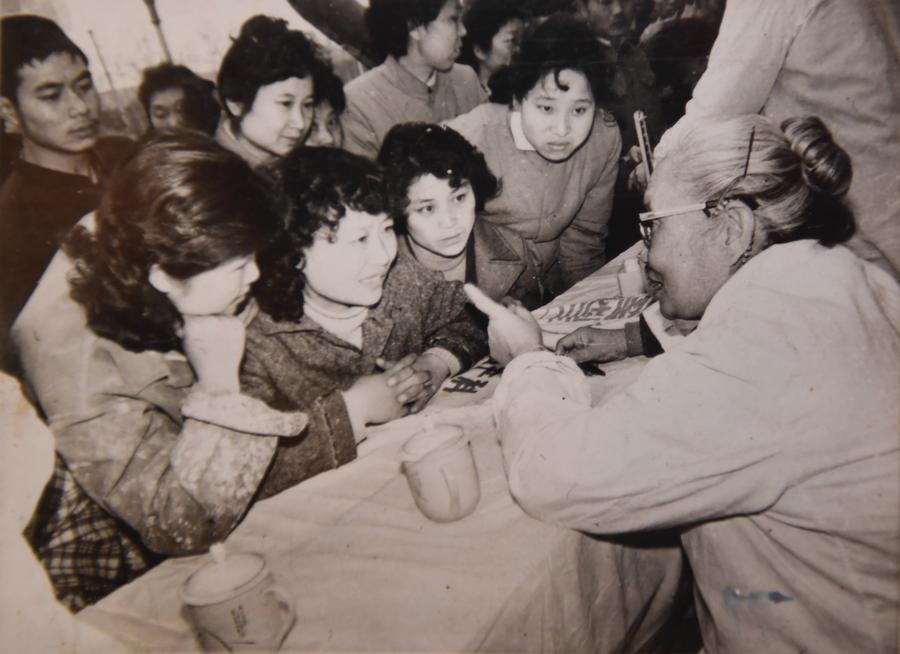 This file photo taken in the 1980s shows Yue Yicheng (1st R) communicating with patients. (Xinhua)
