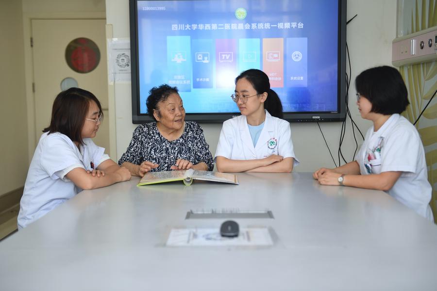 Xie Shuxiang (2nd R) communicates with a patient at a ward of the Affiliate Reproductive Hospital of Sichuan Genitalia Hygiene Research Center in Chengdu, southwest China's Sichuan Province, Aug. 2, 2024. (Xinhua/Liu Kun)