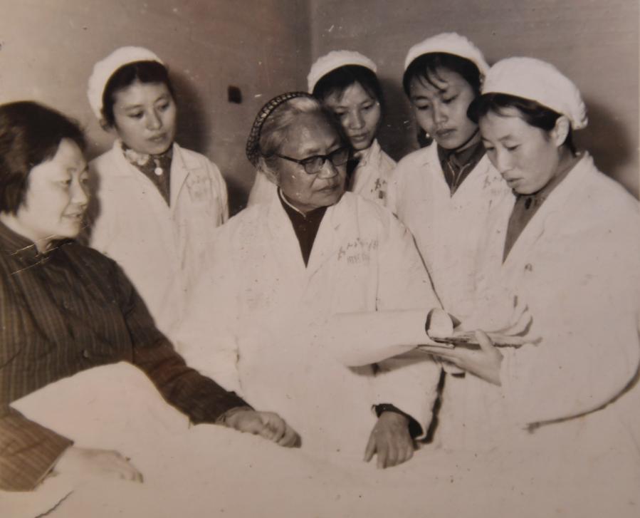 This file photo taken in the 1970s shows Yue Yicheng (3rd L) working at a ward. (Xinhua)
