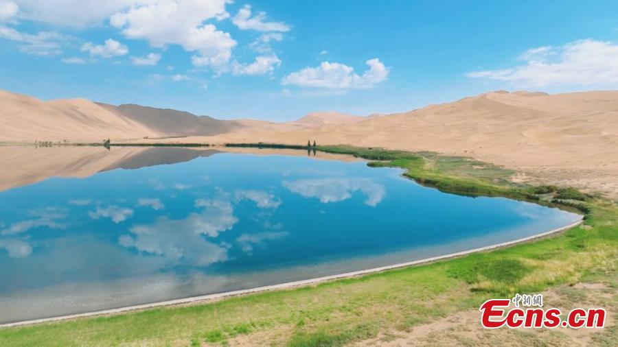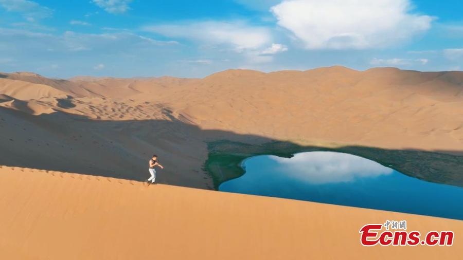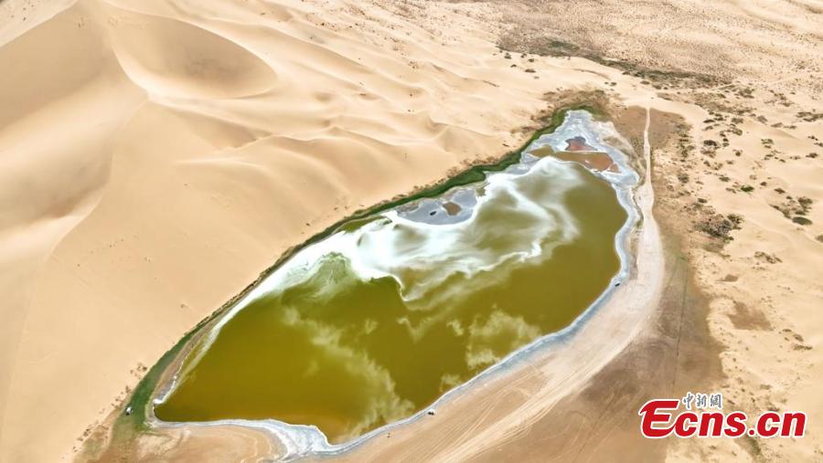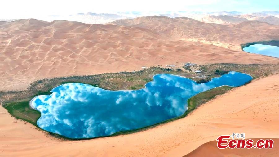 Scenery of the Badain Jaran desert in Alshaa league, north China's Inner Mongolia Autonomous Region. Sapphire-blue lakes coexist with high and low sand hills, presenting an interesting blend of barren and lush landscapes. (Photo: China News Service/Zhang Leyuan)