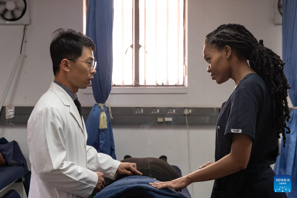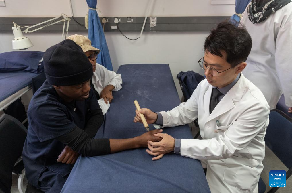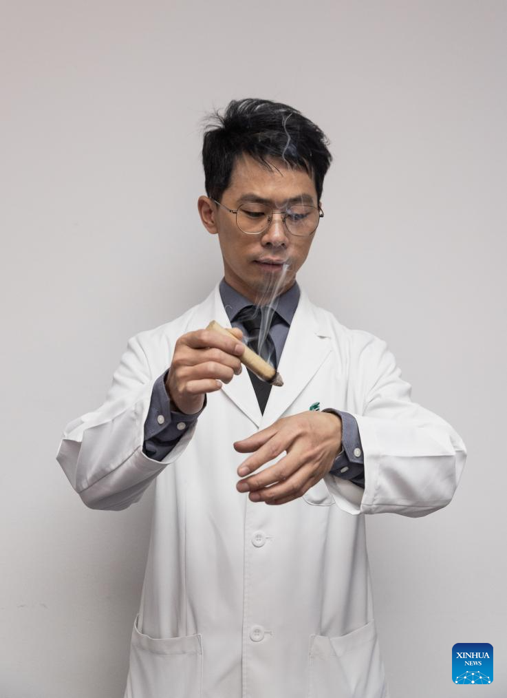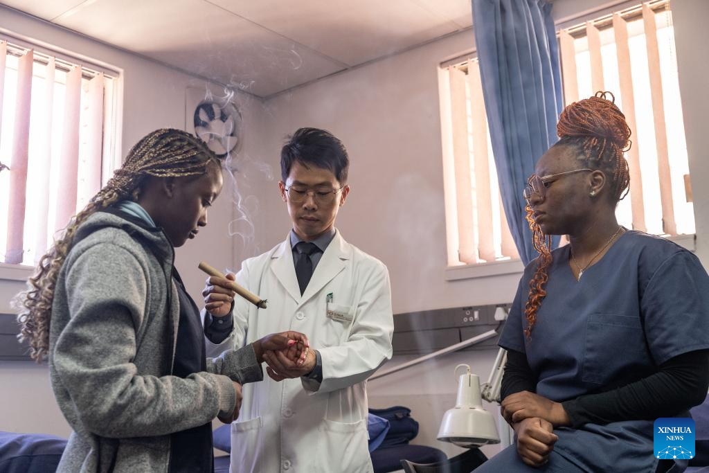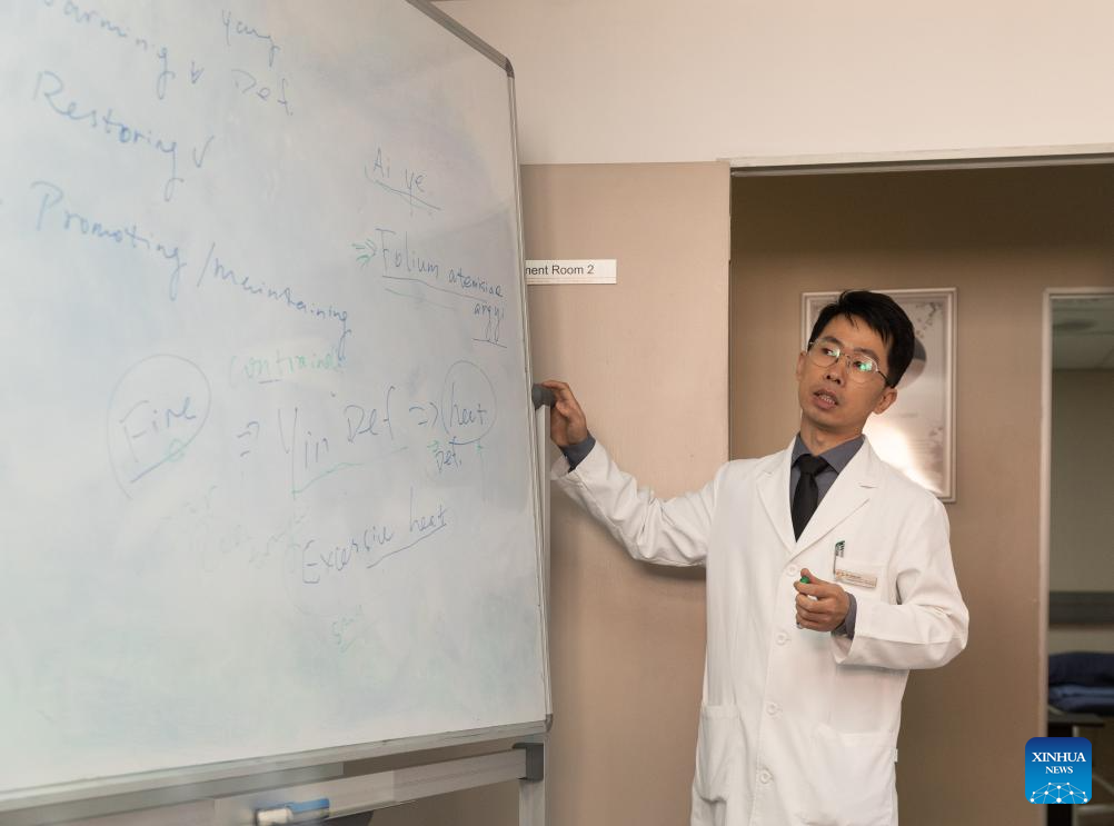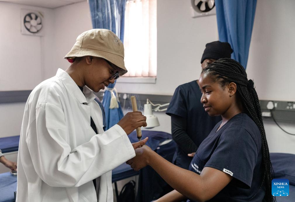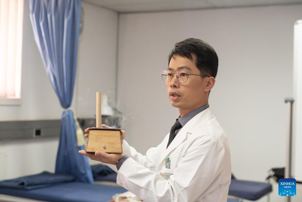 Hu Zijing demonstrates moxibustion techniques during an acupuncture training at University of Johannesburg in Johannesburg, South Africa, on July 29, 2024. (Xinhua/Zhang Yudong)