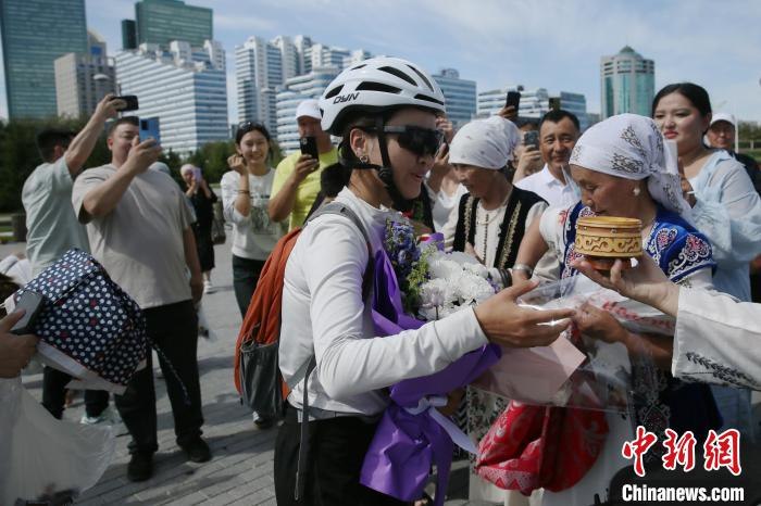 Bu’erlian, a 20-year-old Chinese girl, is warmly welcomed by Chinese expatriates in Kazakhstan after finishing a 25-day cycling journey from China to Kazakhstan, Aug.13, 2024. (China News Service/Shan Lu)