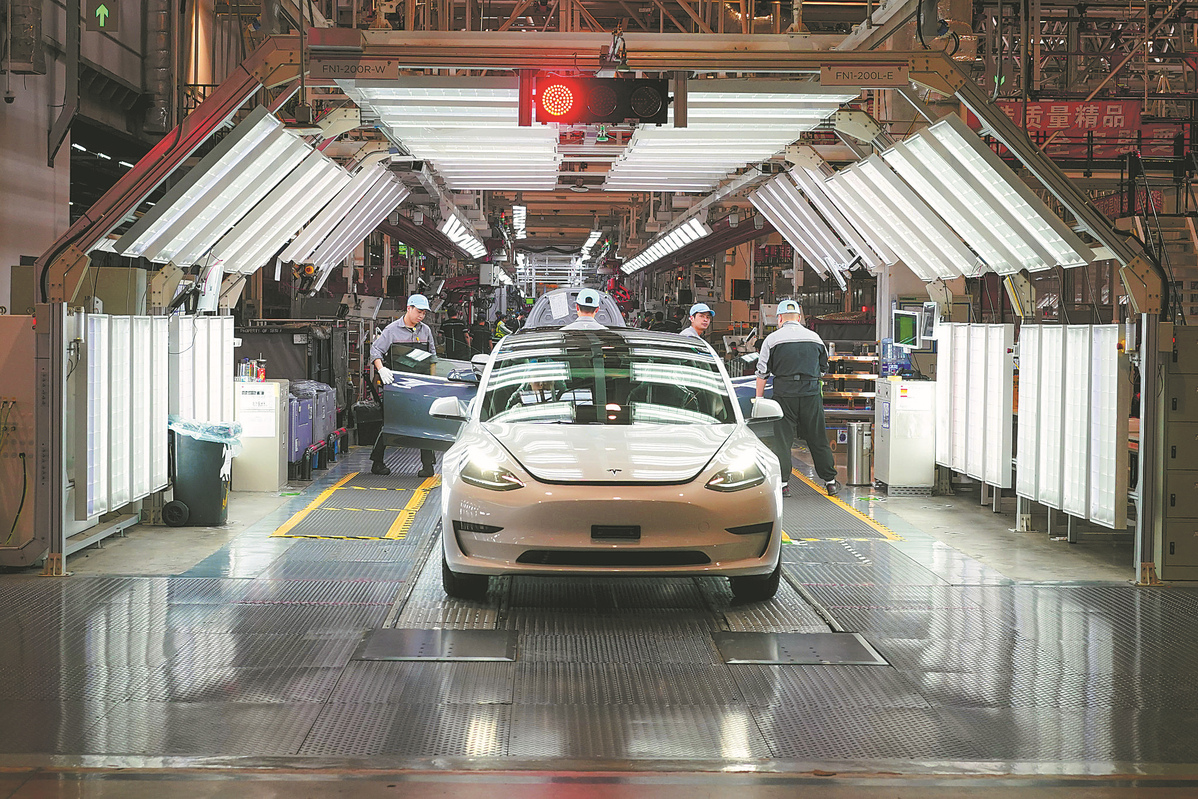 Employees work at Tesla's gigafactory in Lin-gang. (GAO ERQIANG/CHINA DAILY)