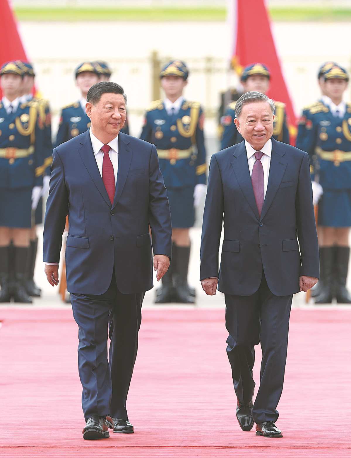 Xi Jinping, general secretary of the Communist Party of China Central Committee and Chinese president, and To Lam, general secretary of the Communist Party of Vietnam Central Committee and Vietnamese president, attend a welcoming ceremony in Beijing on Monday for the Vietnamese leader before their talks at the Great Hall of the People. (FENG YONGBIN/CHINA DAILY)