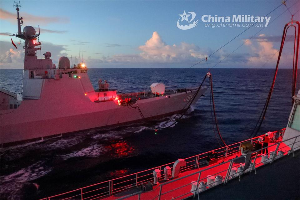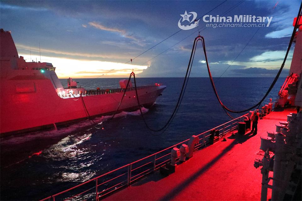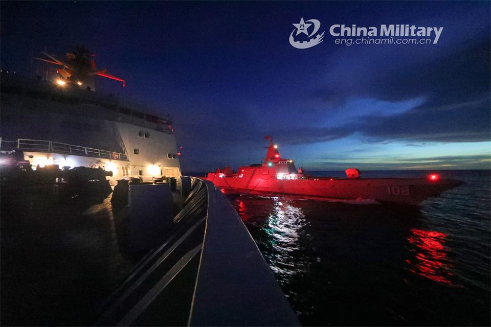 Naval vessels assigned to a flotilla with the navy under the PLA Southern Theater Command steam in formation to conduct nighttime replenishment-at-sea during a comprehensive replenishment training exercise on July 5, 2024. (eng.chinamil.com.cn/Photo by Peng Jun)