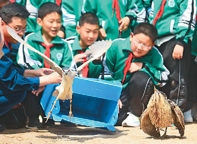 A night heron and a great bittern are released into the wild at the Nandagang wetland in Cangzhou, north China’s Hebei Province. (Photo by Fu Xinchun/Xinhua)