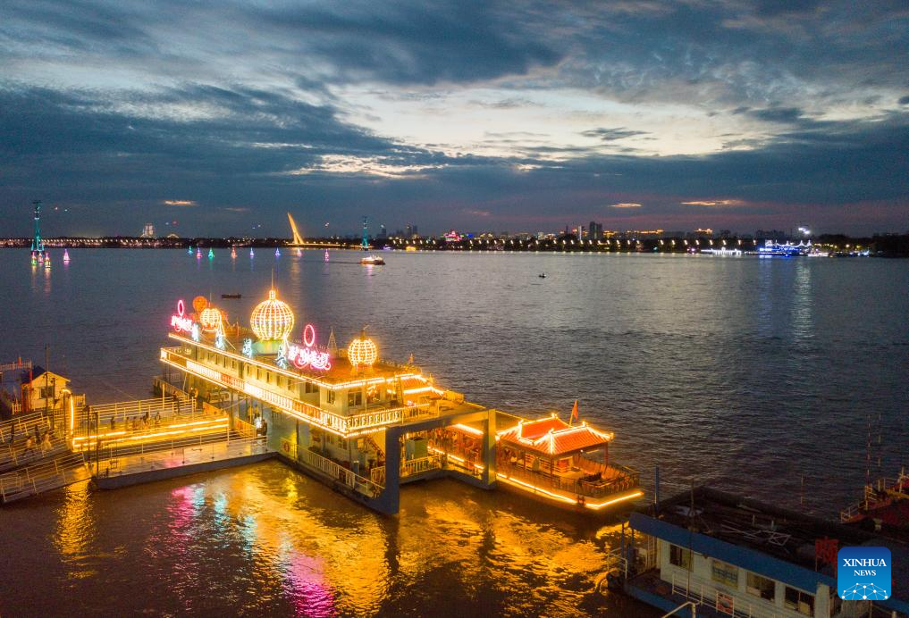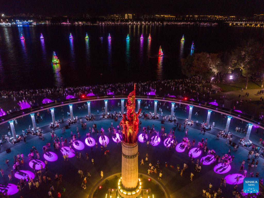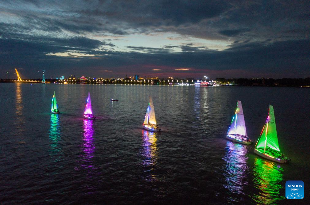 An aerial drone photo taken on Aug. 14, 2024 shows a sailing boat light show on the Harbin section of the Songhua River in Harbin, northeast China's Heilongjiang Province. Known as China's "Ice City", Harbin has a reputation for its cool weather and diversified attractions, even during the summer months, which helps it remain attractive to tourists throughout the year. (Xinhua/Wang Jianwei)