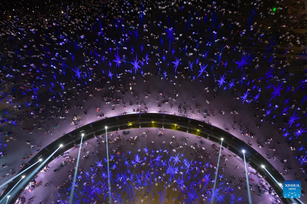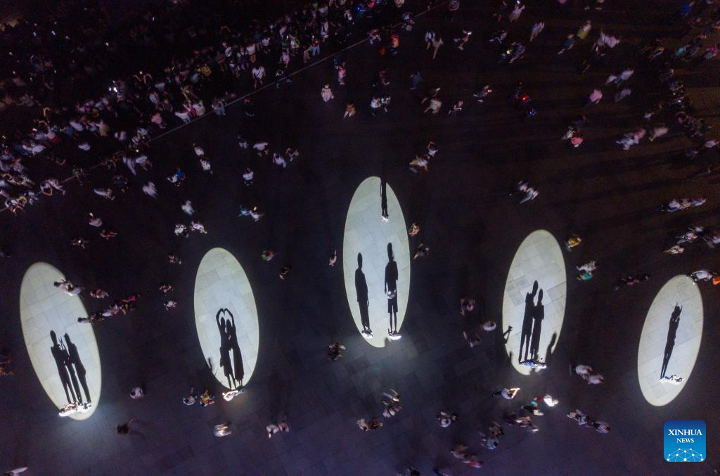 An aerial drone photo taken on Aug. 14, 2024 shows people experiencing a light show in Harbin, northeast China's Heilongjiang Province. Known as China's "Ice City", Harbin has a reputation for its cool weather and diversified attractions, even during the summer months, which helps it remain attractive to tourists throughout the year. (Xinhua/Wang Jianwei)