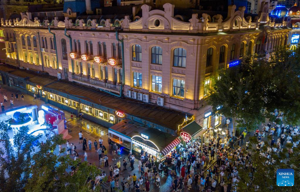 An aerial drone photo taken on Aug. 14, 2024 shows tourists enjoying snacks on the Central Street in Harbin, northeast China's Heilongjiang Province. Known as China's "Ice City", Harbin has a reputation for its cool weather and diversified attractions, even during the summer months, which helps it remain attractive to tourists throughout the year. (Xinhua/Wang Jianwei)