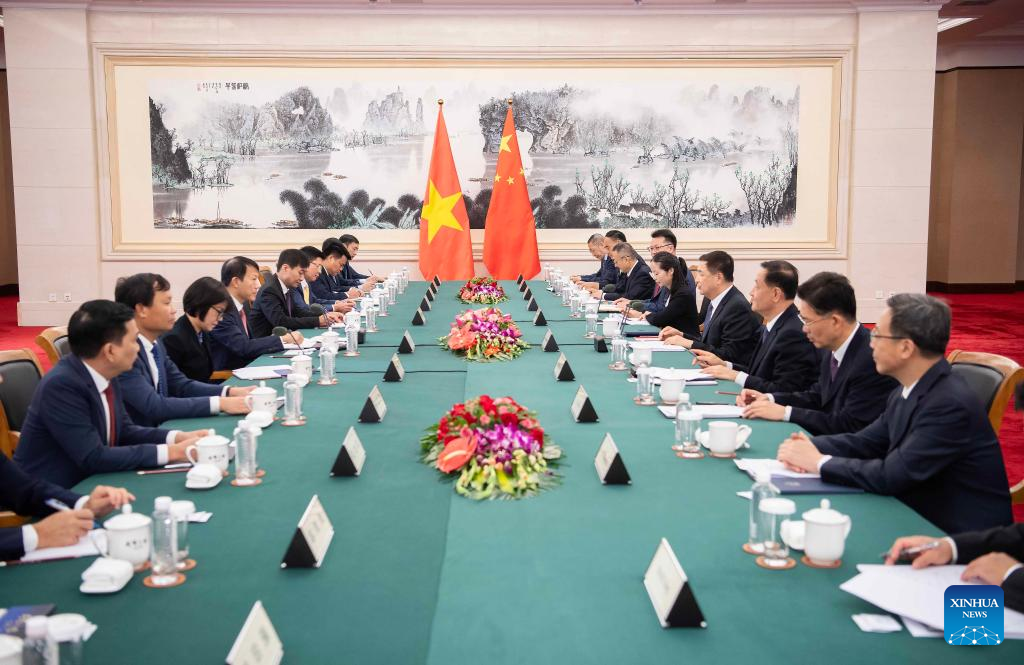 Chinese Minister of Public Security Wang Xiaohong, also a member of the Secretariat of the Communist Party of China Central Committee, meets with Luong Tam Quang, a member of the Political Bureau of the Communist Party of Vietnam Central Committee and Vietnamese Minister of Public Security, in Beijing, capital of China, Aug. 20, 2024. (Xinhua/Li Tao)