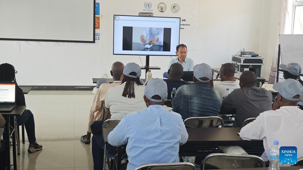 Chen Xiaobin (rear) imparts Juncao technology as locals listen in a lecture at the China-Rwanda Agriculture Technology Demonstration Center in Huye District, Rwanda, Aug. 4, 2024. (Xinhua/Han Xu)