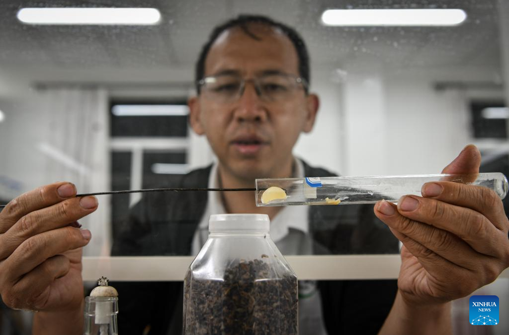 Chen Xiaobin performs mycelium inoculation in a laboratory at the China-Rwanda Agriculture Technology Demonstration Center in Huye District, Rwanda, Aug. 14, 2024. (Xinhua/Han Xu)