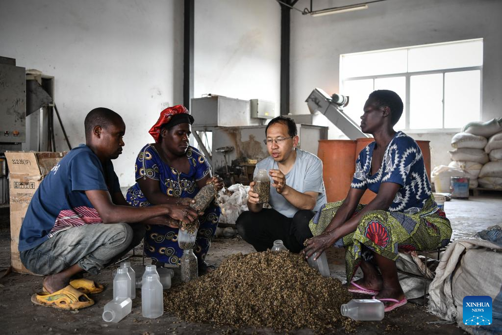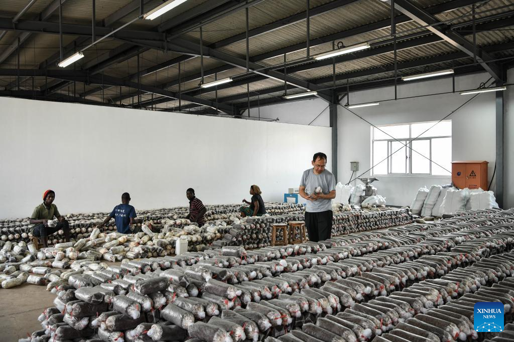 Chen Xiaobin (2nd R) prepares mushroom tubes with local farmers at the China-Rwanda Agriculture Technology Demonstration Center in Huye District, Rwanda, Aug. 13, 2024. (Xinhua/Han Xu)