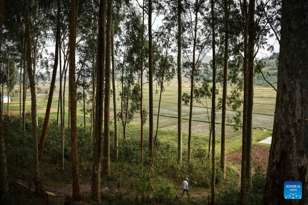 Zheng Ruijin walks to paddy fields in Huye District, Rwanda, Aug. 13, 2024. (Xinhua/Han Xu)