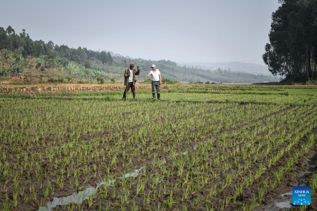 Zheng Ruijin (R) instructs as a farmer looks on in field management at a paddy field in Huye District, Rwanda, Aug. 14, 2024. (Xinhua/Han Xu)