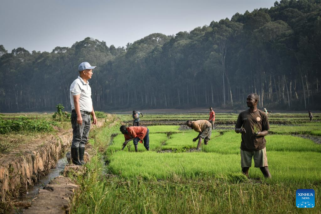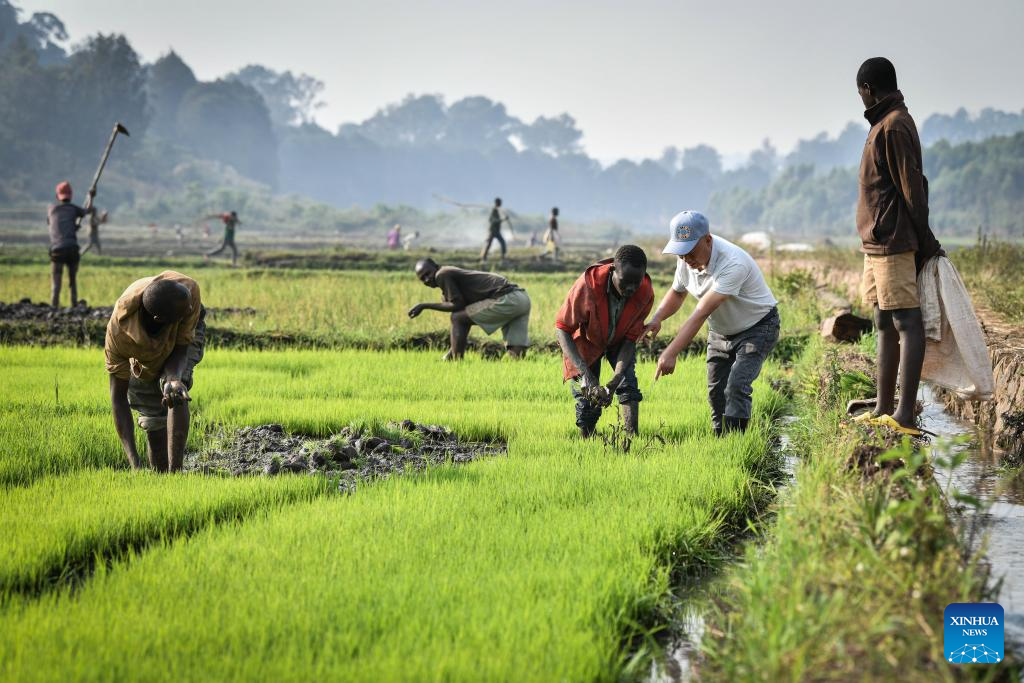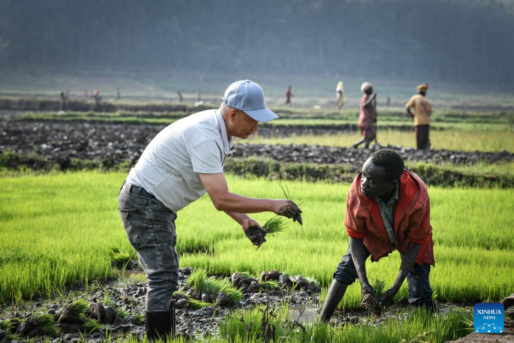 Zheng Ruijin (2nd R) instructs as farmers transplant rice seedlings at a paddy field in Huye District, Rwanda, Aug. 14, 2024. (Xinhua/Han Xu)