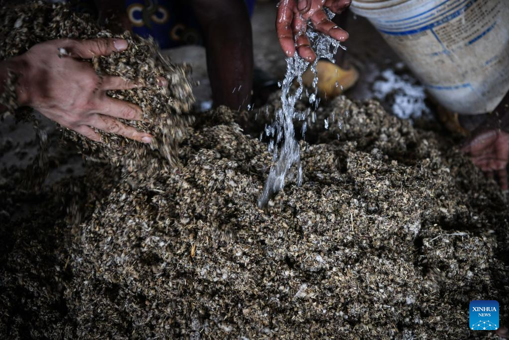 Chen Xiaobin adds water in the material as a part of preparation to make mushroom tubes with the help of local farmers at the China-Rwanda Agriculture Technology Demonstration Center in Huye District, Rwanda, Aug. 13, 2024. (Xinhua/Han Xu)