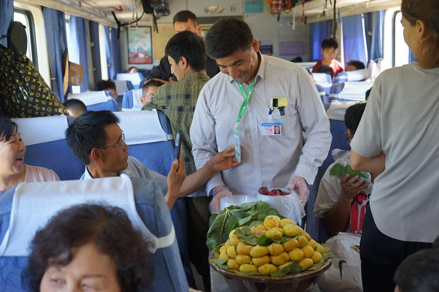 A tourist scans the payment QR code to pay for the figs he bought from vendor Yimamamat Saipar onboard the train No. 7557, Aug. 1, 2024. (Xinhua/Jin Bowen)