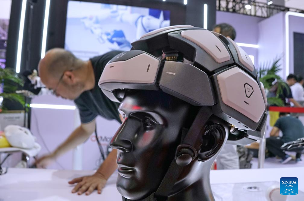 An intelligent electroencephalogram (EEG) device is pictured during the World Robot Conference 2024 in Beijing, capital of China, Aug. 21, 2024. The World Robot Conference 2024 opened here on Wednesday. (Xinhua/Li Xin)