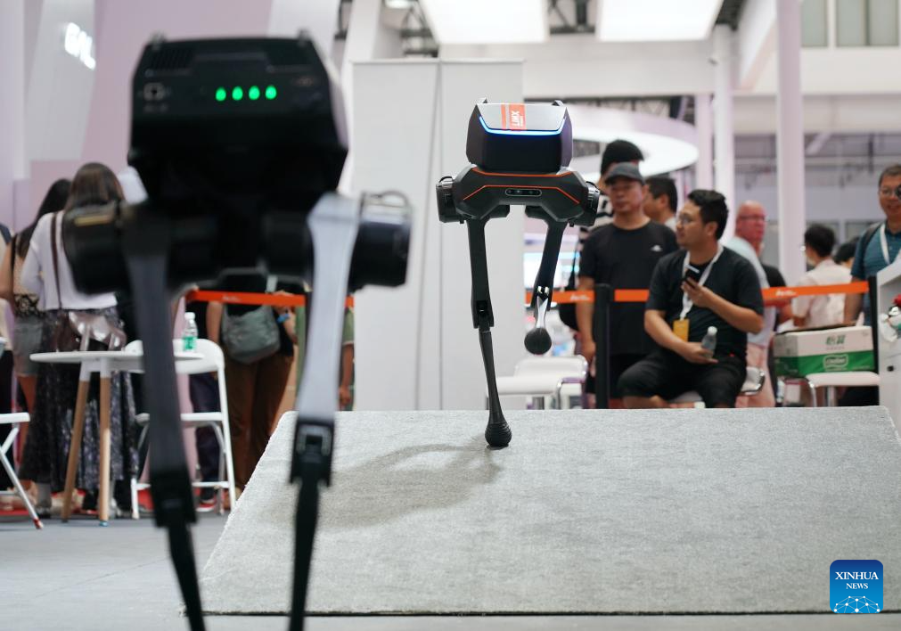 A biped robot demonstrates climbing skills during the World Robot Conference 2024 in Beijing, capital of China, Aug. 21, 2024. The World Robot Conference 2024 opened here on Wednesday. (Xinhua/Zhang Chenlin)