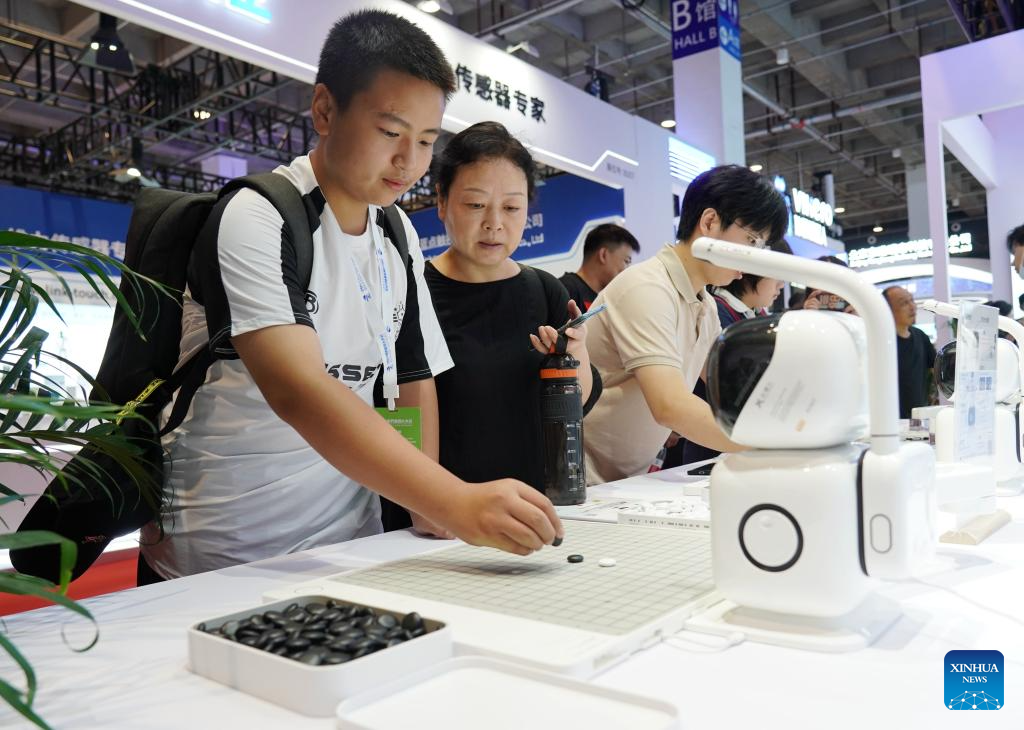 A visitor plays Go game, known as Weiqi in Chinese, with a robot during the World Robot Conference 2024 in Beijing, capital of China, Aug. 21, 2024. The World Robot Conference 2024 opened here on Wednesday. (Xinhua/Zhang Chenlin)