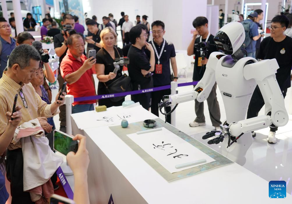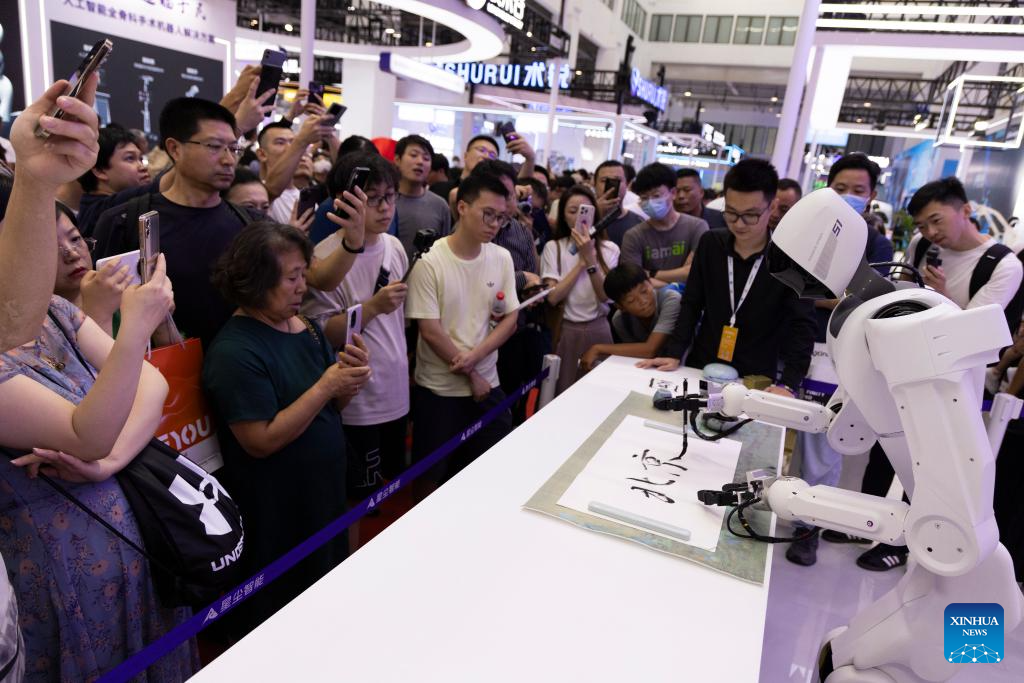 Visitors watch as a robot writes Chinese calligraphy during the World Robot Conference 2024 in Beijing, capital of China, Aug. 21, 2024. The World Robot Conference 2024 opened here on Wednesday. (Xinhua/Zhang Chenlin)