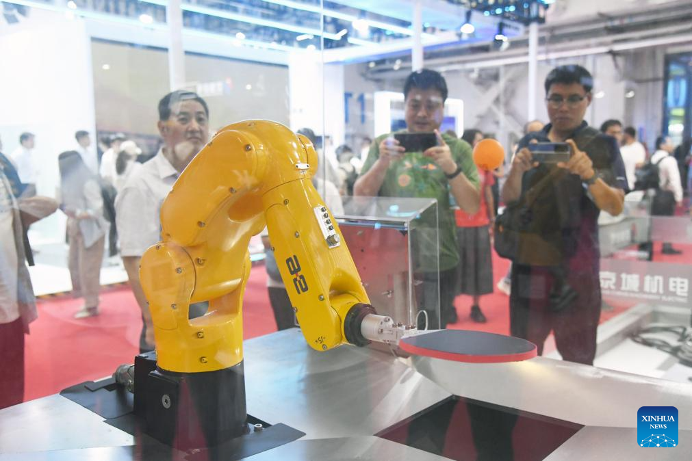 Visitors watch as a robot plays ping-pong during the World Robot Conference 2024 in Beijing, capital of China, Aug. 21, 2024. The World Robot Conference 2024 opened here on Wednesday. (Xinhua/Chen Zhonghao)