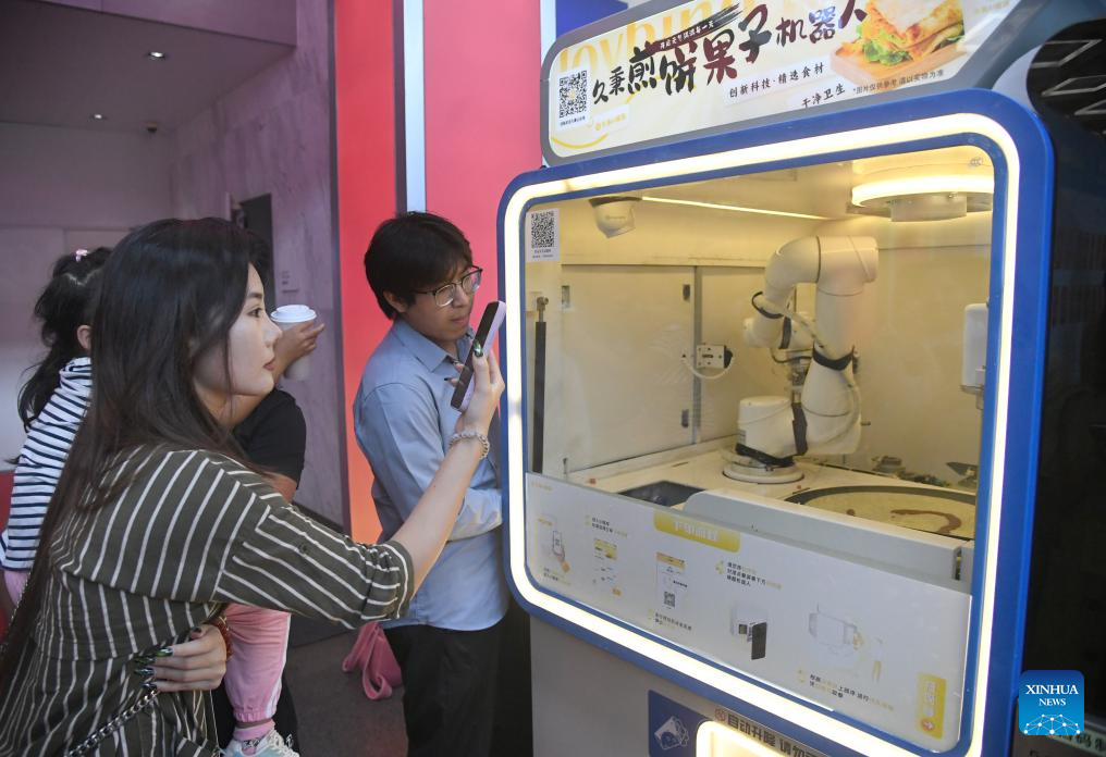 Visitors watch as a robot makes Jian Bing, or the Chinese crepe, during the World Robot Conference 2024 in Beijing, capital of China, Aug. 21, 2024. The World Robot Conference 2024 opened here on Wednesday. (Xinhua/Chen Zhonghao)