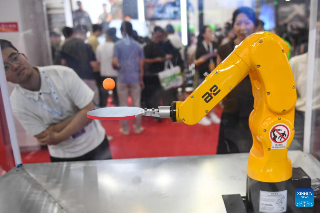 A robot plays ping-pong during the World Robot Conference 2024 in Beijing, capital of China, Aug. 21, 2024. The World Robot Conference 2024 opened here on Wednesday. (Xinhua/Ren Chao)