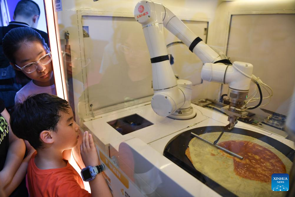 A robot makes Jian Bing, or the Chinese crepe, during the World Robot Conference 2024 in Beijing, capital of China, Aug. 21, 2024. The World Robot Conference 2024 opened here on Wednesday. (Xinhua/Ren Chao)