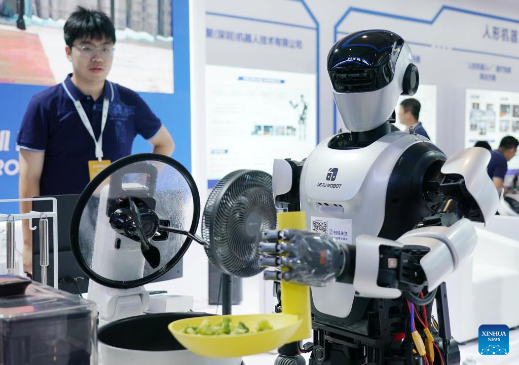 A humanoid robot demonstrates cooking skills during the World Robot Conference 2024 in Beijing, capital of China, Aug. 21, 2024. The World Robot Conference 2024 opened here on Wednesday. (Xinhua/Zhang Chenlin)