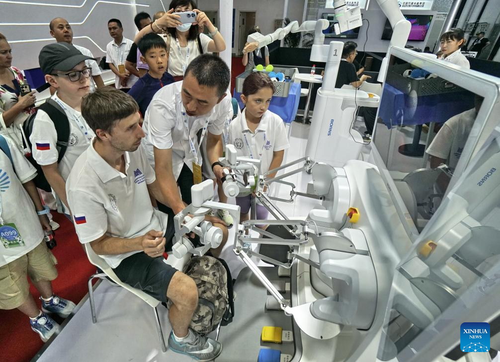 A visitor interacts with a medical robot during the World Robot Conference 2024 in Beijing, capital of China, Aug. 21, 2024. The World Robot Conference 2024 opened here on Wednesday. (Xinhua/Li Xin)