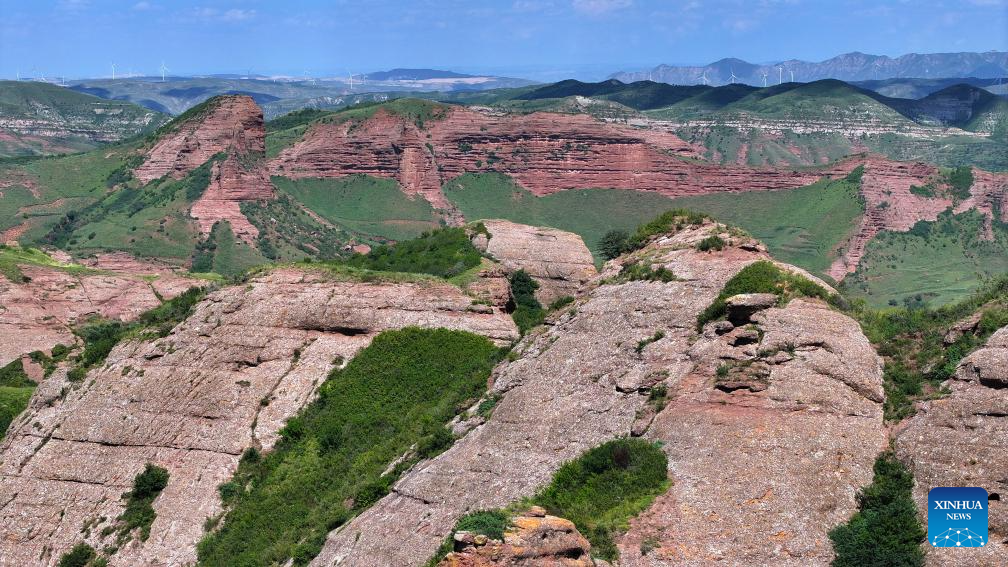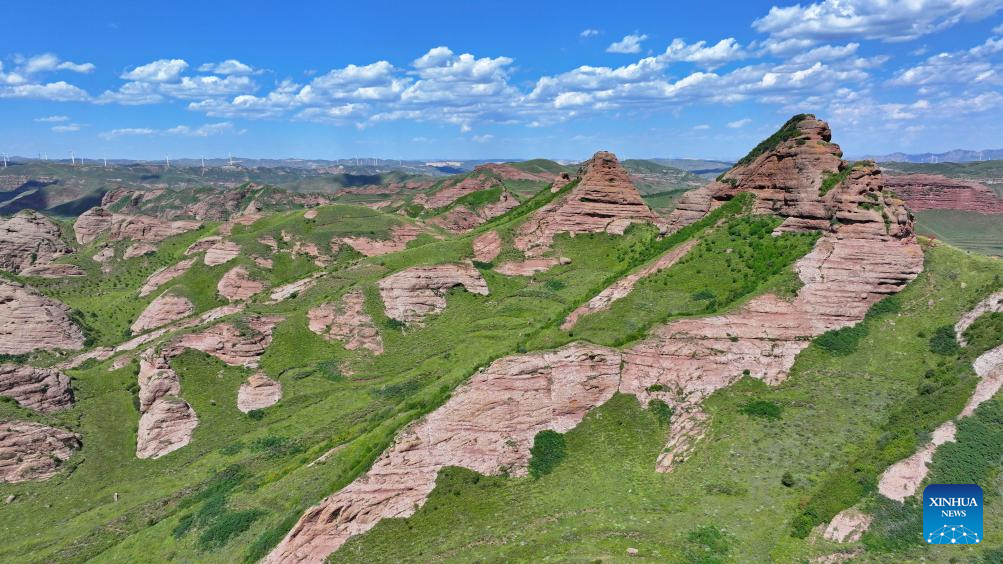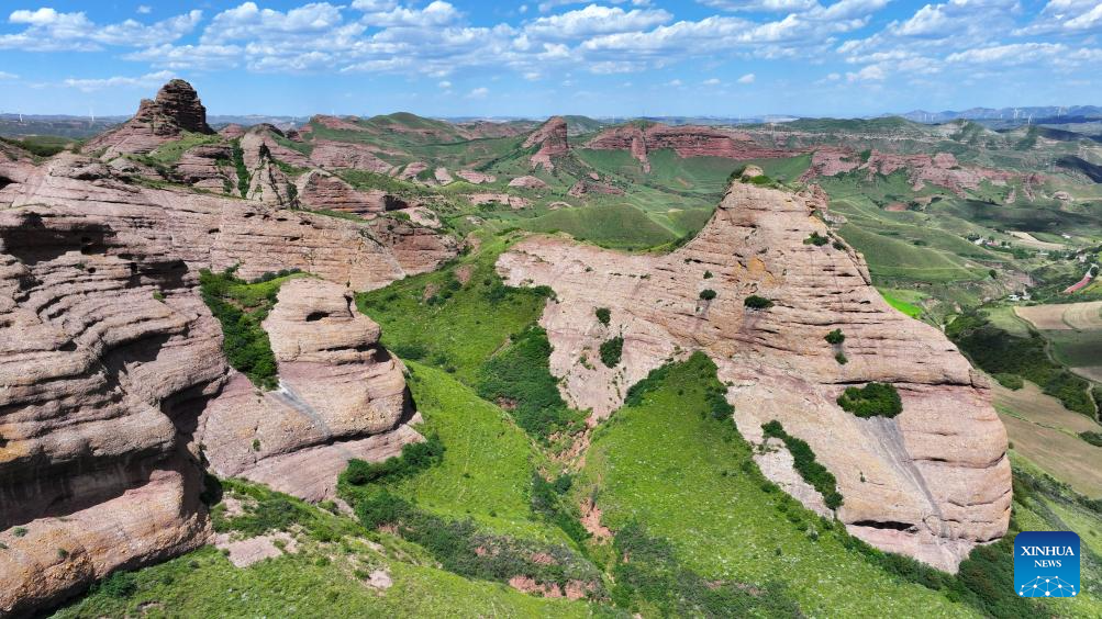 An aerial drone photo shows the Danxia landform at the Huoshizhai National Geological (Forest) Park in Xiji County of Guyuan, northwest China's Ningxia Hui Autonomous Region, Aug. 18, 2024. The park is famous for its Danxia landform, a unique type of geomorphology formed from red-colored sandstones and characterized by steep cliffs. (Xinhua/Wang Peng)