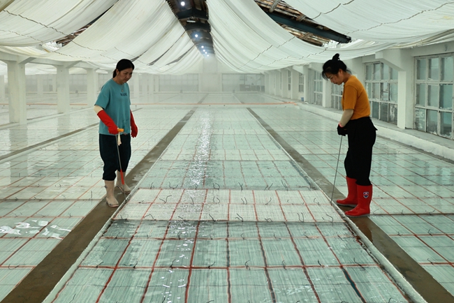 Workers take care of kelp seedlings at a seedling room of Guanwu Marine Products Development Co., Ltd. in Lianjiang county, Fuzhou city, southeast China's Fujian Province. (Photo/Li Ningwei)