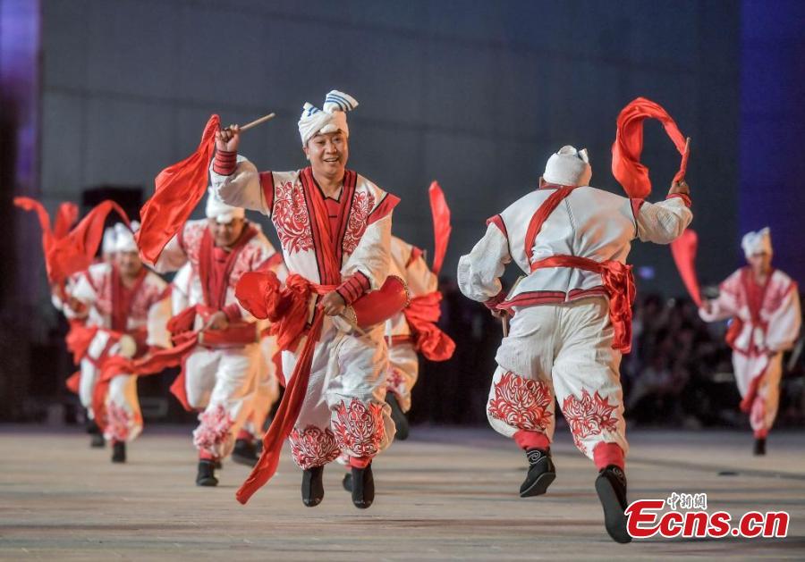 Artists from northwest China's Shaanxi Province perform waist drums during the first folk art season in Urumqi, northwest China's Xinjiang Uygur Autonomous Region, Aug. 20, 2024. (Photo: China News Service/Liu Xin)