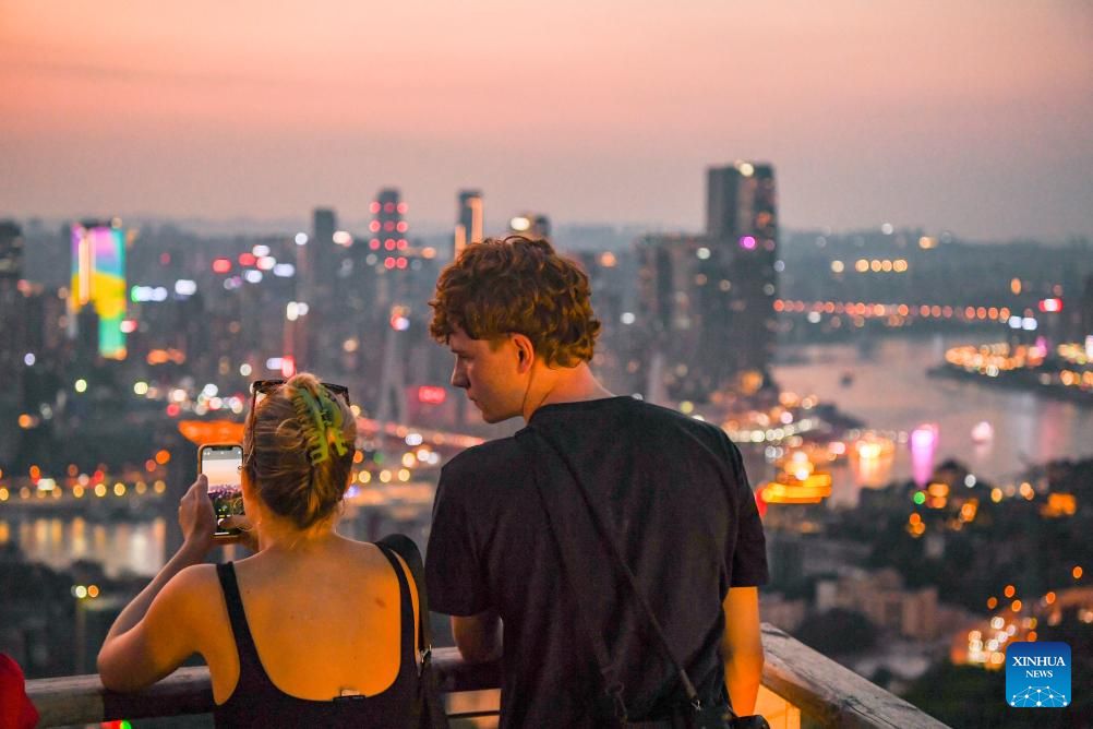 Tourists enjoy the city view of southwest China's Chongqing Municipality, Aug. 21, 2024. (Xinhua/Wang Quanchao)
